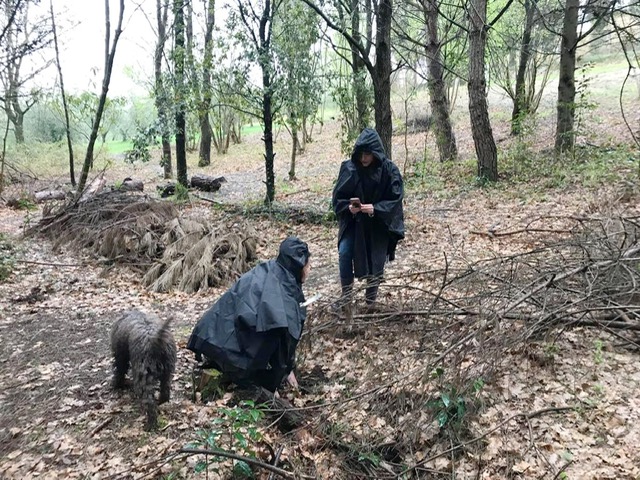 Así que allí, que nos encontramos en medio del bosque con Chocco, el perro trufero, ataviados con chubasqueros anti-moda y lloviendo como si no hubiera un mañana.