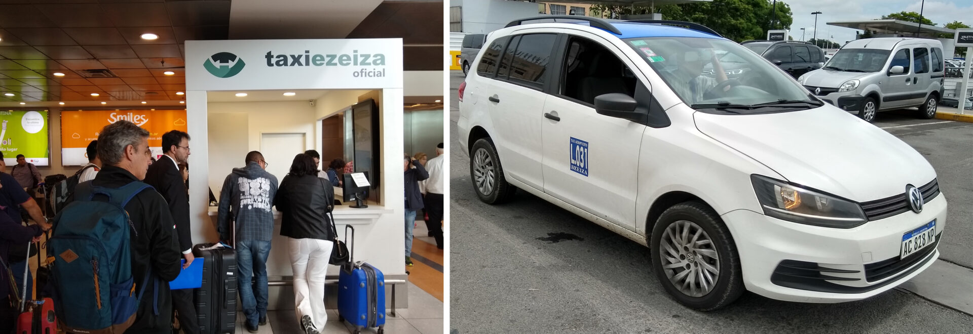 En Ezeiza puedes realizar el pago en el mostrador de la agencia de remises que se encuentra dentro, y al día de la fecha un Remis cuesta aprox. ARG$ 700 (12 USD/€)