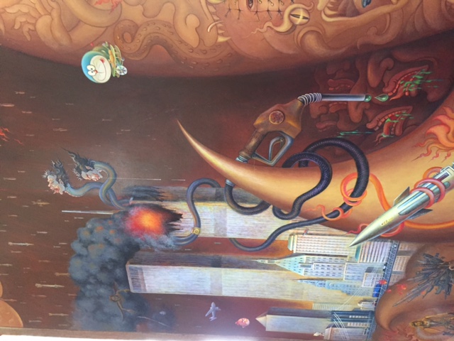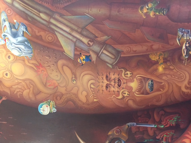 Y cuando entras dentro, ya sí que te llevas las manos a la cabeza, puesto que los frescos y pinturas del interior combinan, figuras mitológicas con elementos modernistas y rompedores: superhéroes, naves espaciales, las torres gemelas en llamas e incluso los MINIONS, y otros personajes infantiles…