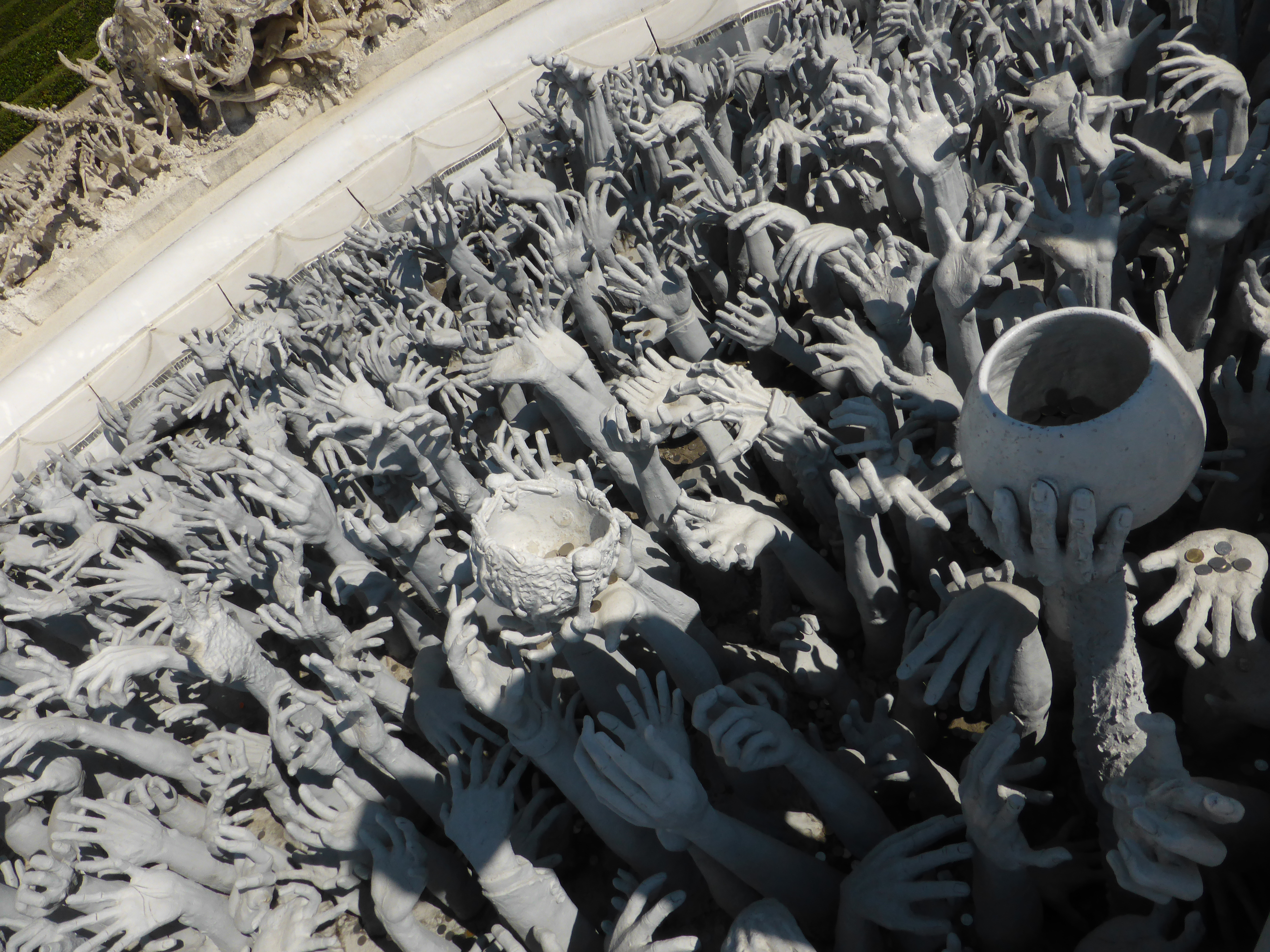 La entrada al templo, queda simulada con cientos de manos blancas y esqueléticas, emergiendo de un foso, que parecen querer salir de los infiernos, suplicando y representan el dolor y sufrimiento humano.