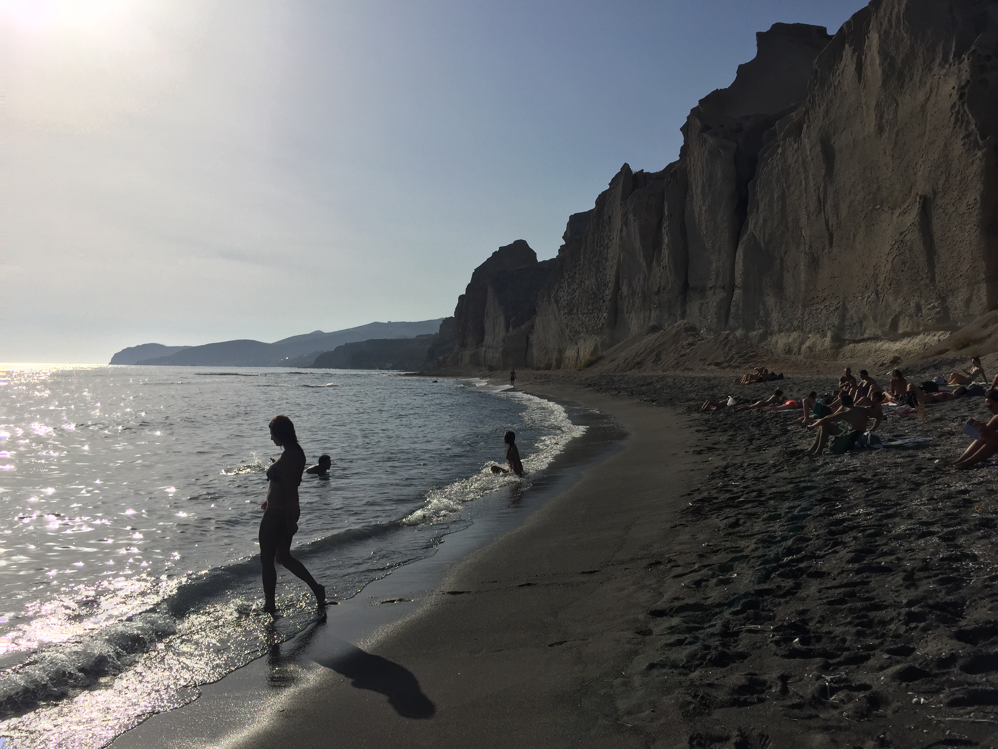 – Kamari Black Beach, seguramente sea la más famosa, mide unos 4 km de largo y es muy ancha, con aguas poco profundas ideales para familias con hijos. Está al lado opuesto de Thira y muy cercana al aeropuerto. Además desde Kamari también zarpan los barcos turísticos hacia la caldera.