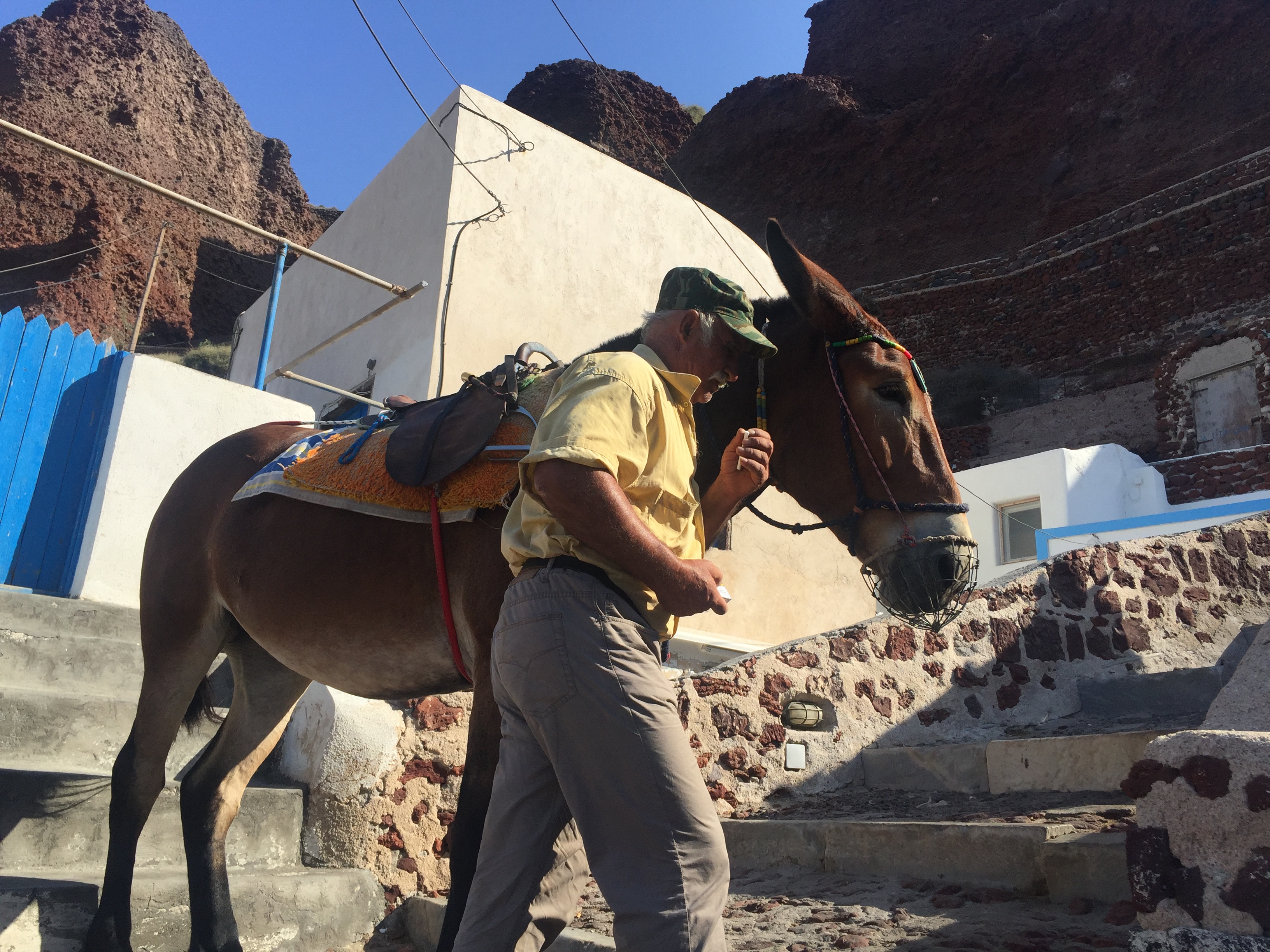 En Oia, también tienes el pequeño puerto de Ammoudi, está lleno de botes pequeños. Para llegar, hay que bajar unas 300 escaleras, y se accede por la zona de detrás del castillo. Si eres de esos perezosos a los que no les gusta subir andando, tienes la opción de subir con burrito, al puro estilo beduino, como si estuvieses subiendo al monasterio de Petra.