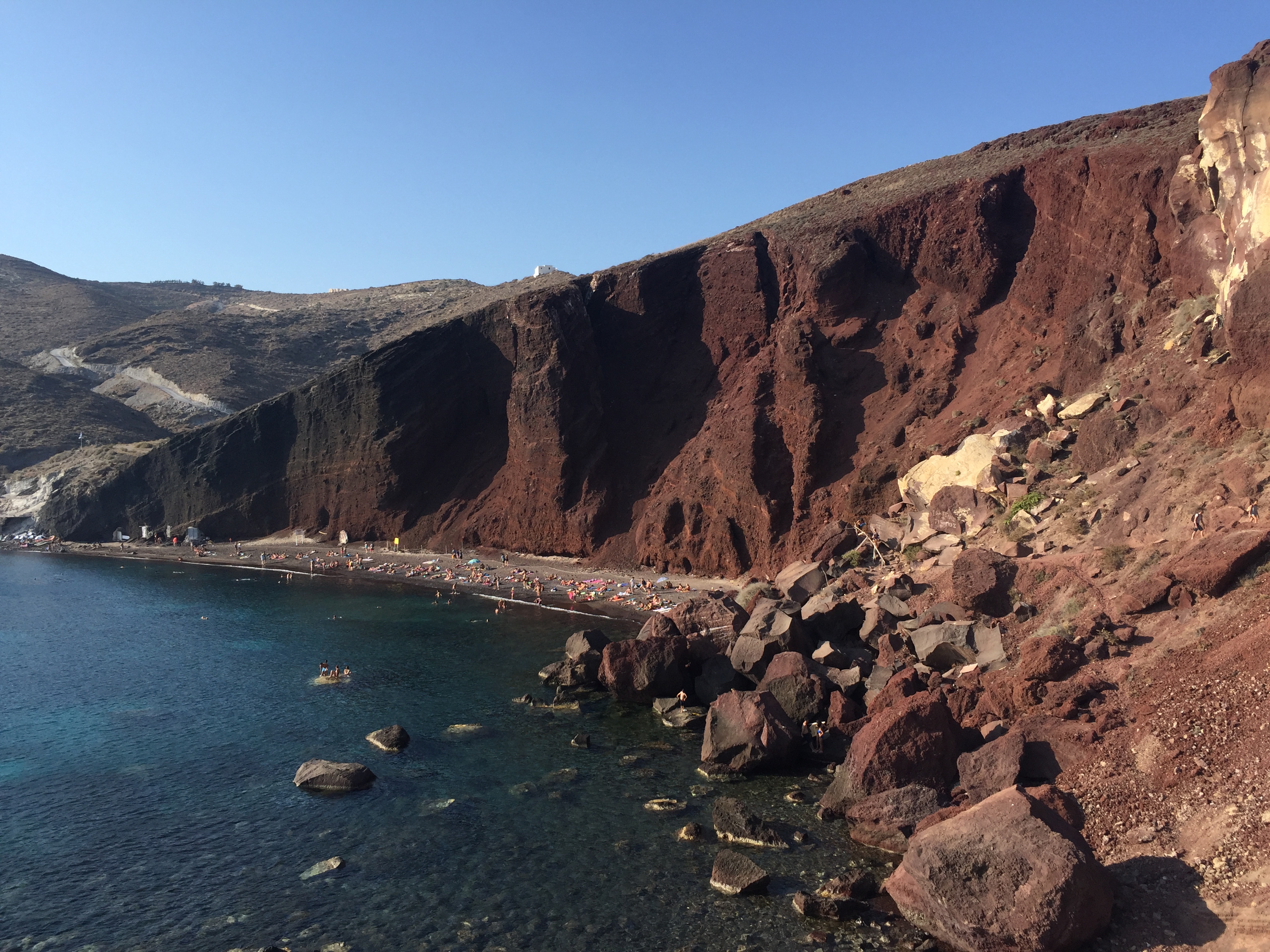 – La Playa roja (Kokkini Paralia), debe el nombre a los fascinantes acantilados de color rojo, de piedra volcánica de color rojizo. El pueblo más próximo es Akrotiri.