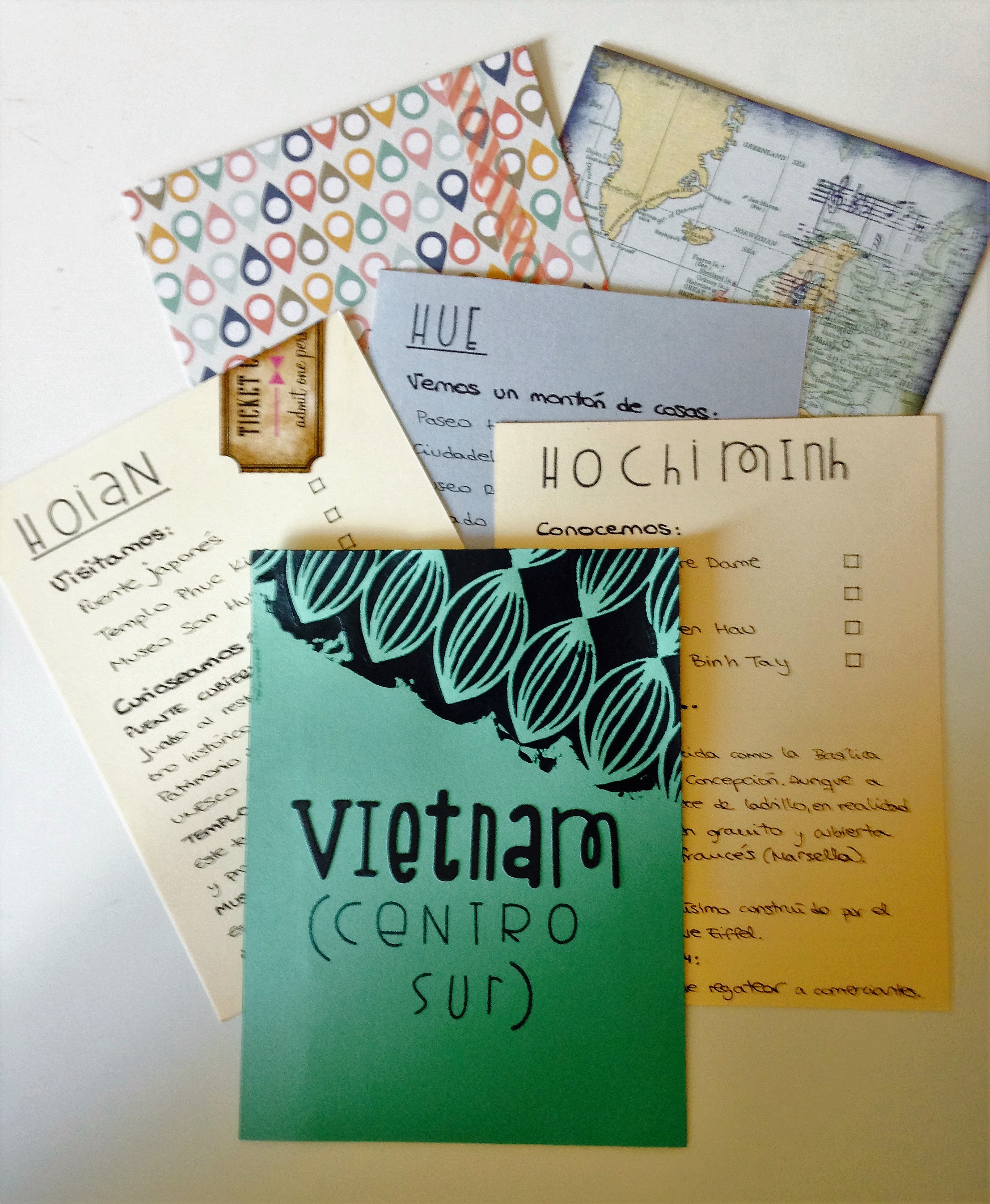 El Diario de viaje tiene estas características: unas 15-20 hojas de unos 11×15 cm, de bolsillo, para que no ocupe mucho y lo puedas llevar cómodamente en el viaje, con hojas lisas de colores para escribir planning e impresiones y hojas decoradas para pegar fotos, tiquets o lo que te apetezca.  También pone un bolsillo para guardar tiquets, billetes de avión, entradas, etc..no es muy grande pero lo suficiente para guardar alguna cosita.